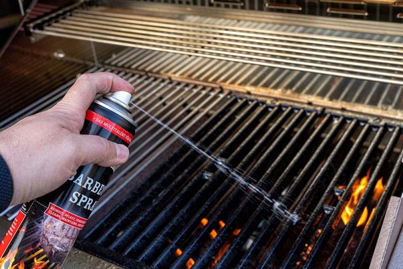 - Zuerst gründlich reinigen: Entferne alle Rückstände von Produktion oder vorherigen Nutzungen. Bürste den Rost gut mit einer Messingbürste ab um ihn vor Kratzern zu bewahren und wasch ihn gründlich ab. Anschließend komplett trocknen lassen. Am besten direkt im Grill.