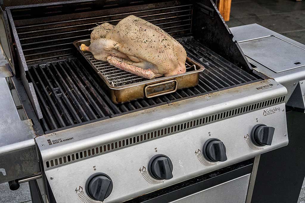 Heizen Sie den Grill auf eine Temperatur von 170°C vor. Legen Sie die gefüllte und gewürzte Weihnachtsgans in den indirekten Bereich vom Gasgrill.