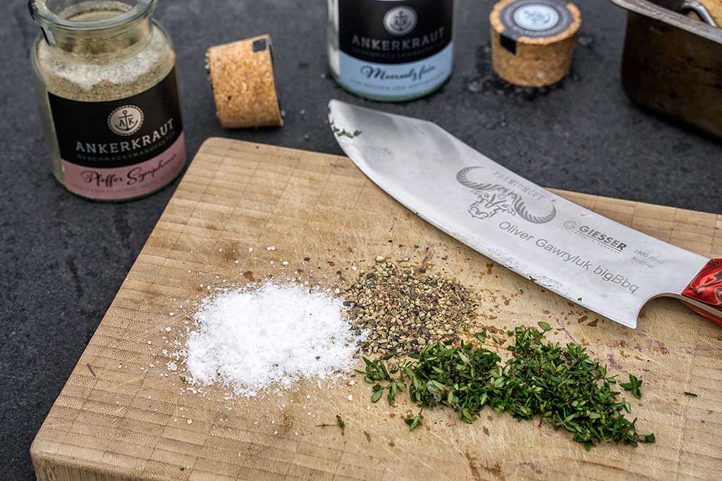 Vermengen Sie jeweils 1-2 EL Thymian, Pfeffer und Salz zu einer Gewürzmischung.