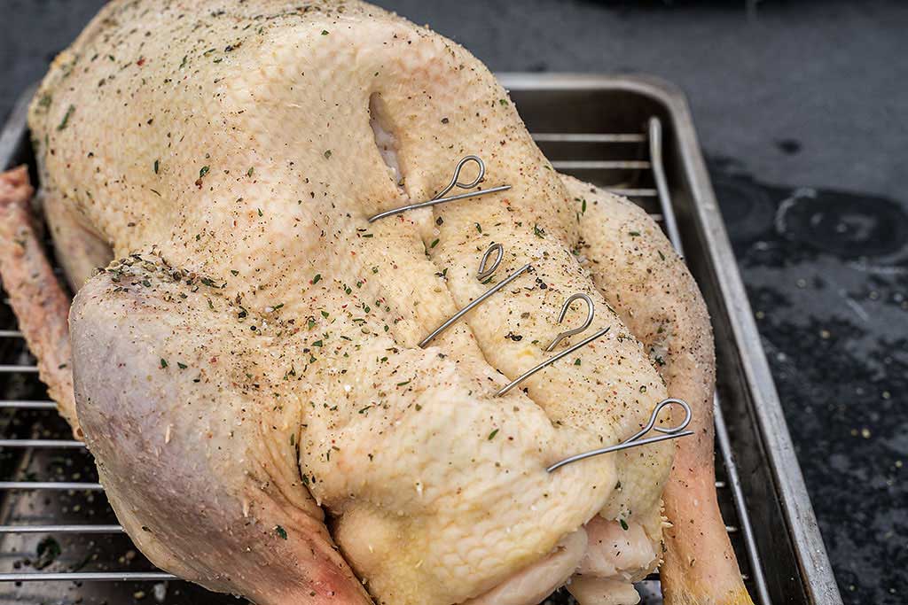 Legen Sie die Weihnachtsgans auf das Rost einer Auflaufform, damit sich das Fett beim Grillen sammeln kann.