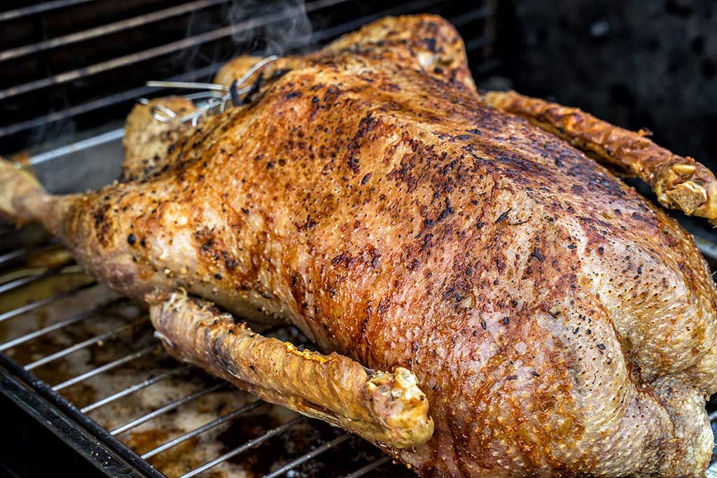 Nachdem die Gans für ca. 1 Stunden bei geschlossenem Grilldeckel garte, drehen Sie die Gans auf die Seite. Dadurch kann das Fett noch besser ablaufen. Nach 20 Minuten kann die Gans wieder zurückgedreht werden. Anschließend für weitere 2 Stunden garen lassen, bis die Weihnachtsgans völlig durchgegart ist. Die optimale Kerntemperatur beträgt ca. 90°C.