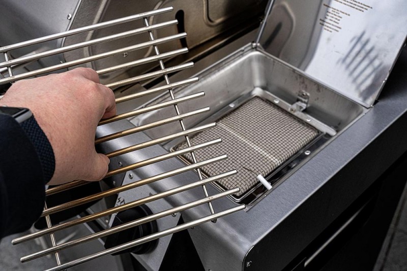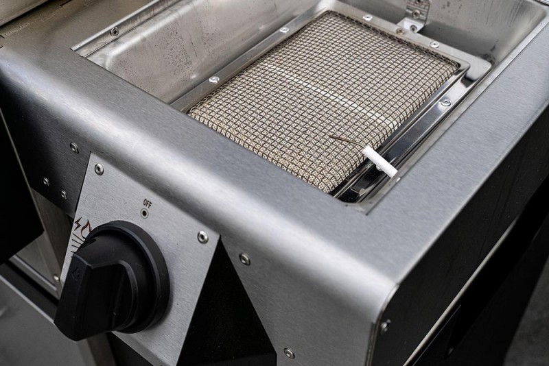Im aufgeklappten Zustand ist die Powerzone umgehend einsatzbereit. Der aufrecht stehende Deckel ist sehr praktisch, denn er schützt des Weiteren vor Fettspritzer auf den Terrassenplatten. Apropos Fettspritzer: An den Infrarotbrenner vorbeitropfende Fette und Fleischsäfte werden in der unter der 800° Powerzone verbauten Fettauffangschale gesammelt. Wie bei Schickling-Grill üblich, ist auch der Grillrost der Powerzone aus lebensmittelechtem Edelstahl gefertigt, welcher ohne Probleme den sehr hohen Temperaturen von über 800°C standhält.