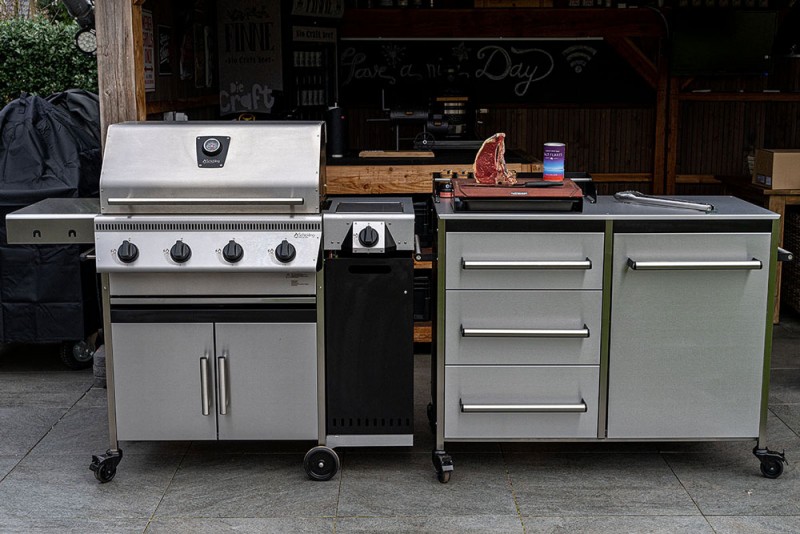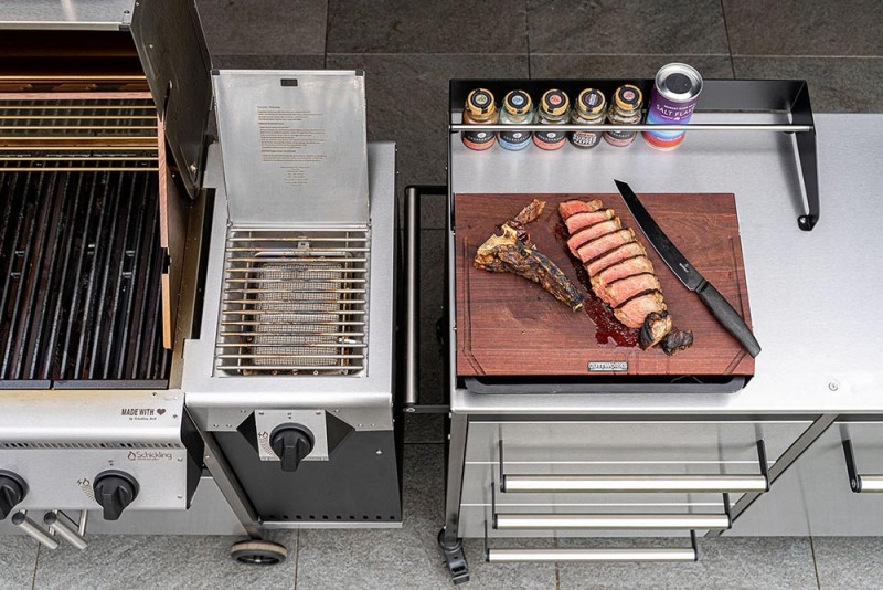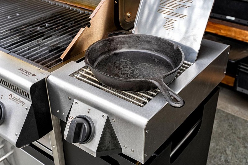 Nachdem die Powerzone verbaut bzw. nachgerüstet wurde, zeigt sie sich im rechten Seitentisch des jeweiligen Grills, in unserem Fall der Schickling-Grill Walter XL, neben dem Grilltisch „Big Buddy“. Ist der Keramikbrenner nicht in Gebrauch, verdeckt und schützt ein stabiler klappbarer Deckel den Infrarotbrenner, sodass der Seitentisch z. B. als Ablage für Grill-Tools und Grillgut verwendet werden kann.