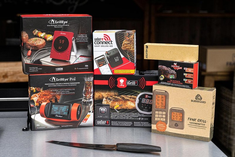Da das Fleisch im Innern des Steaks noch roh ist, muss dieses nun nachgegart werden. Dazu heizen wir unseren Hermann XL - Deluxe auf ca. 150°C auf, platzieren das Steak in den indirekten Bereich des Grills und garen dieses bei geschlossenem Deckel bis zu einer Kerntemperatur von ca. 52°C (medium-rare). Zur Überwachung der Kerntemperatur stecken wir einen Temperaturfühler zentriert in das Fleisch. Bei der Auswahl des geeigneten Grillthermometers präferieren wir kein bestimmtes Modell, trotzdem empfehlen wir ein Thermometer eines Markenherstellers.
